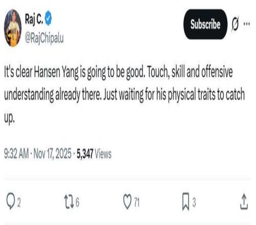 另外一位湖人记者Raj Chipalu给出相同的看法:“杨瀚森未来可期!他已经拥有出色的球感、技术与进攻意识,万事俱备,仅差身体素质了。”