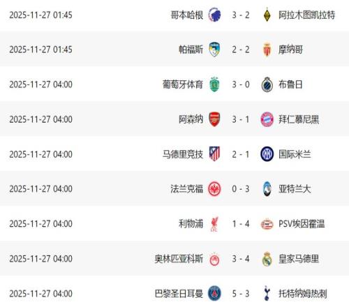 北京时间11月27日凌晨,欧冠联赛阶段第5轮第二个比赛日,包括阿森纳、拜仁、巴黎、皇马、利物浦、国米、马竞等多家豪门悉数出战,上演悲喜一夜。