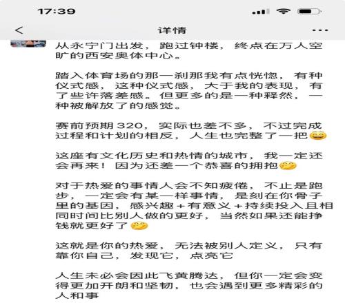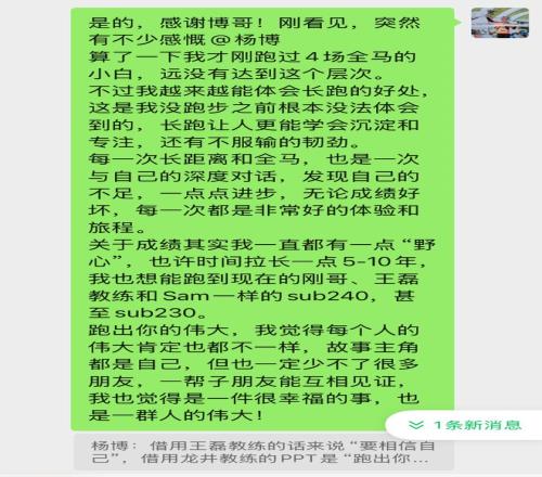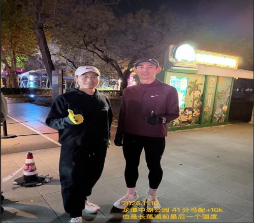 感谢我的所有教练们,特别是龙井教练,因为在赛前对自己的状态基本有认知,99%是PB不了的。赛前几周的连续作战,倒数第二周的强度,虽然也按期减量调整,但状态却越来越差。为什么还有1%呢?因为对于既定好的目标,怎么也要大声说出来,并且只要站上了赛道,我也永远相信那个敢于出发和挑战的自己。真不行,也得跑完再说不行。