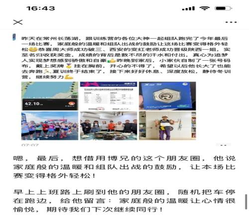 但这几个月的一起训练,以及这一场集体“出征”的长荡湖,让我感到更多的是这一帮子“战友”,这是真正让马拉松充满温馨和开心的地方。