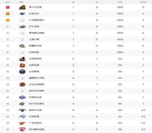 广厦男篮是率先打响第一轮比赛的,王博的队伍以88-74击败山西男篮,拿到了新赛季的开门红,从而以得失分率1.189,排在积分榜第一位。