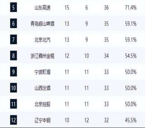 黑马深圳与山东分列第四、第五,山东少赛一场但胜场占优,理论上排名第四。两队近期状态火热,10战8胜,展现出强劲的竞争力。另一黑马青岛队击败北京止住五连败颓势,排名第六;北京则遭遇两连败,排名下滑至第七,球队磨合问题与主教练许利民的用人策略备受质疑。浙江队虽位列第八,但本轮负于广厦暴露了与顶级强队的实力差距。